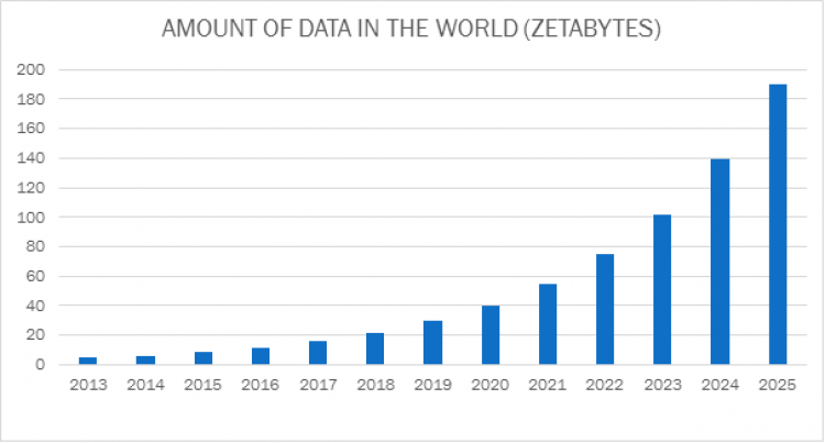 In their 2014 report “The digital universe of opportunities” IDC estimates that by 2020 [the digital universe] contain[s] nearly as many digital bits as there are stars in the [physical] universe. It is doubling in size every two years, and by 2024 the digital universe – the data we create and copy annually – will reach 149 zettabytes. The amount of data in the world growing even faster than we can process it.