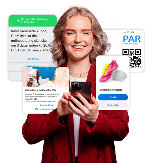 Kombiner op til 10 rige kort i en enkelt interaktiv enhed, som dine kunder kan swipe igennem. Rul, swipe og tryk - en nem og engagerende kundeoplevelse.