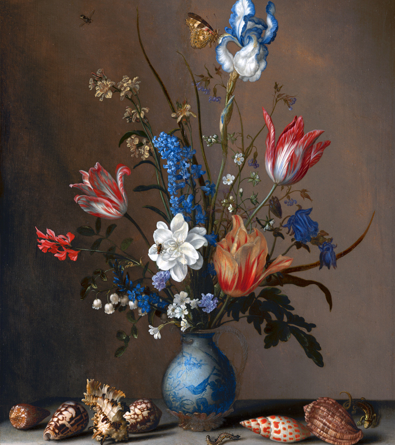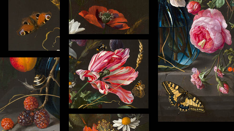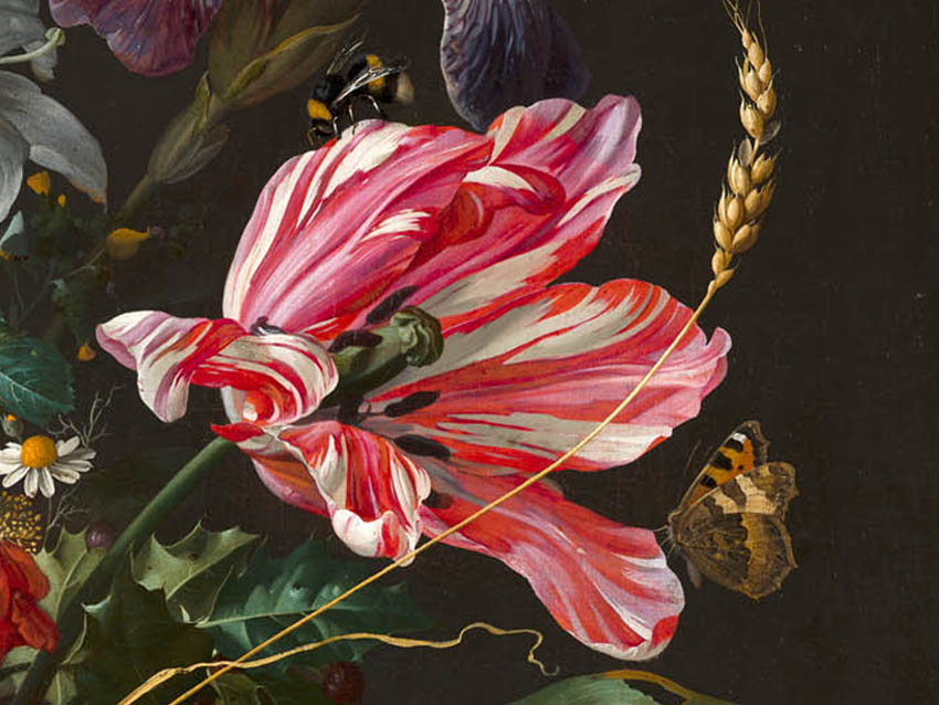 Daar wist de kunstenaar Jan Davidsz de Heem alles van! Hij was de invloedrijkste bloemenschilder van zijn tijd. Hier geen stijf boeket. Sta je voor zijn Vaas met bloemen uit c.1670, dan zie je een bonte overdaad aan bloemen, die over de rand van de vaas hangen. Heel wat anders vergeleken met de bloemstillevens uit de vroege 17de eeuw die je ook in het Mauritshuis kunt bekijken.