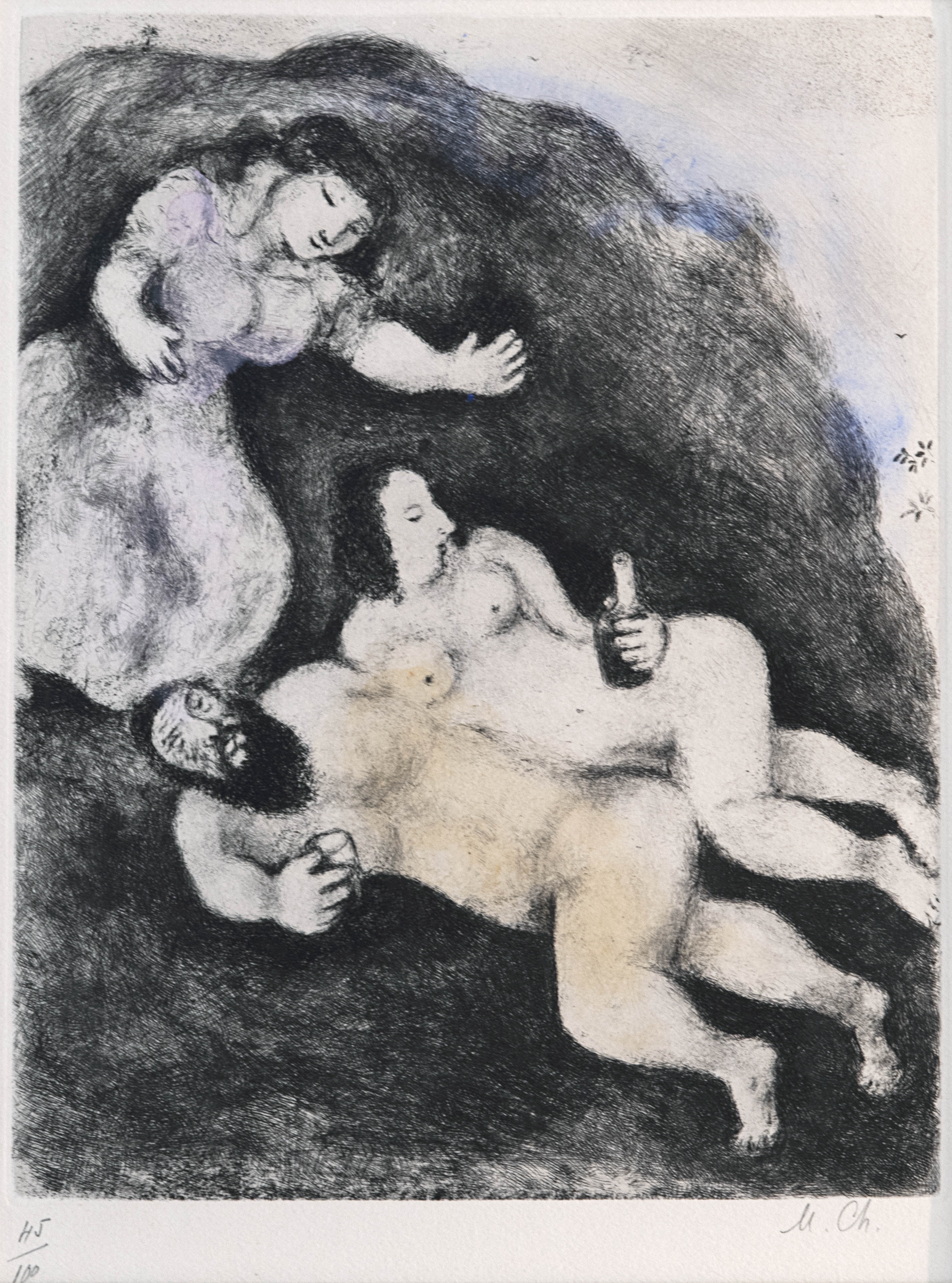 Wat een verschillende werken heeft Marc Chagall weten te creëren. Zie hier 'De jonge weduwe' uit de Fabels van La Fontaine. En daaronder 'Lot en zijn dochters'. Is het toeval dat het weer veel vrouwen zijn? Niet echt.