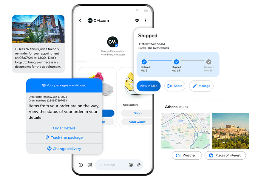 Bring your text messages to life with rich media, interactive buttons and quick replies. Boost engagement and build customer trust with verified sender profiles - all from the native SMS inbox of the mobile devices of your customers. No additional apps or downloads required!