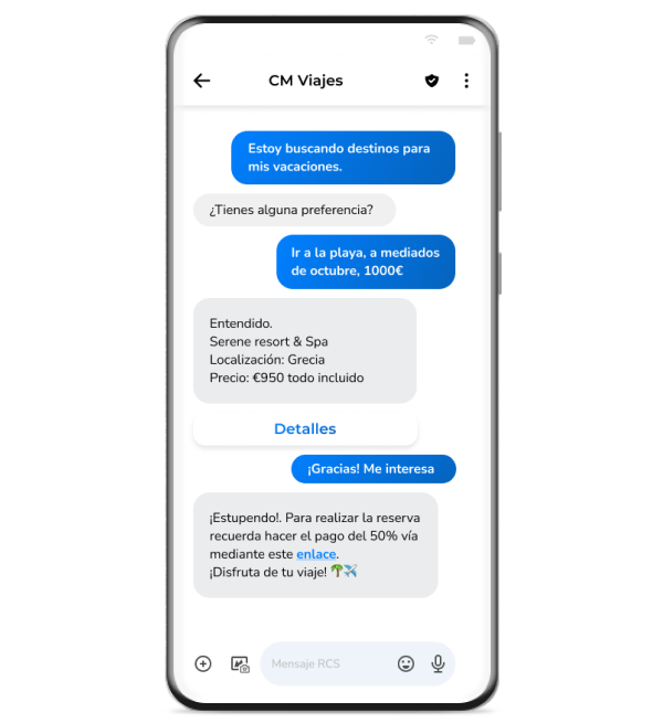 RCS ofrece innumerables opciones para que los clientes interactúen con las marcas reservando citas, completando transacciones o incluso viendo actualizaciones de entrega en tiempo real sin salir de su aplicación de mensajería.