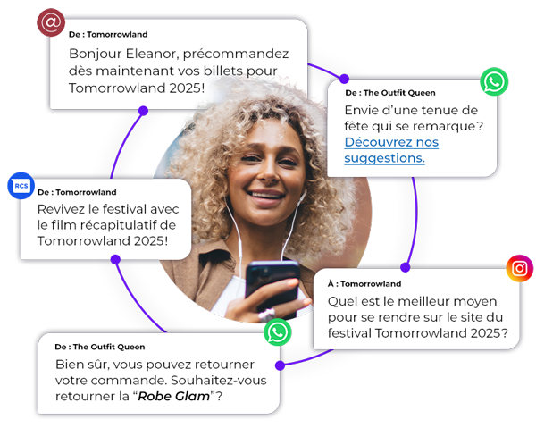 Que ce soit pour du service client, des campagnes, des notifications, du transactionnel, utilisez notre plateforme pour engager vos clients sur leurs canaux préférés. Combinez WhatsApp, Apple Messages for Business, Twitter, RCS, et tous les autres canaux, ou sélectionnez uniquement les canaux que vos clients utilisent.