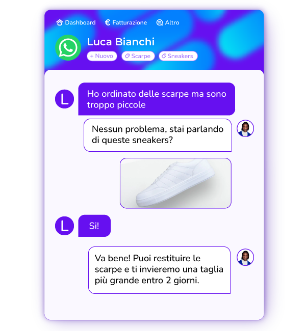 Inizia una conversazioneAiuta i clienti a trovare le risposte utilizzando un assistente virtuale, un chatbot AI, un voicebot, FAQ, o una base di conoscenza. Automatizza le conversazioni e crea le soluzioni self-service.