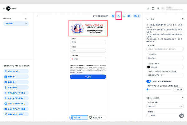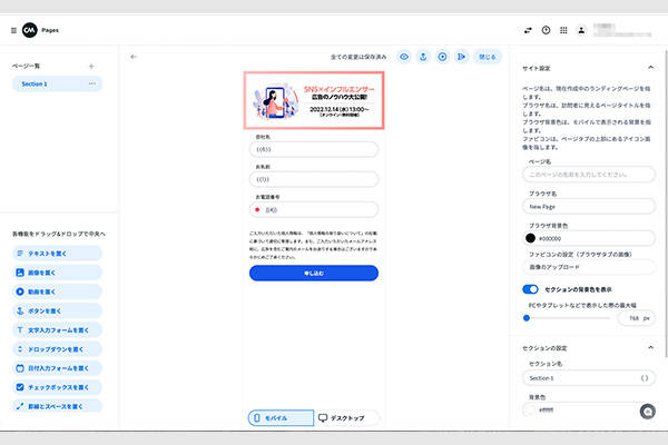 などを見やすく簡潔に書きましょう。今回は「コンテンツ」の中の、「画像」「ボタン」「テキスト」のみでこのように作成しました。