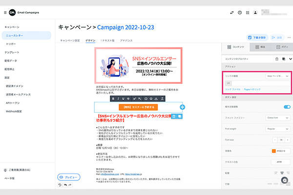 次に、配信したEメールからセミナー申込ができるようにCTAボタンのリンク先を設定します。