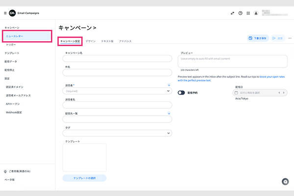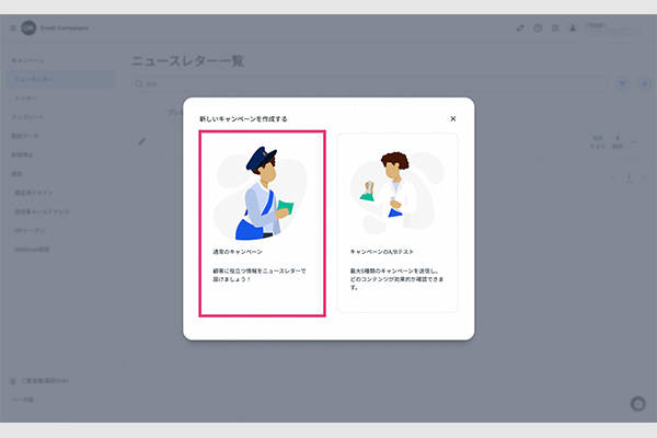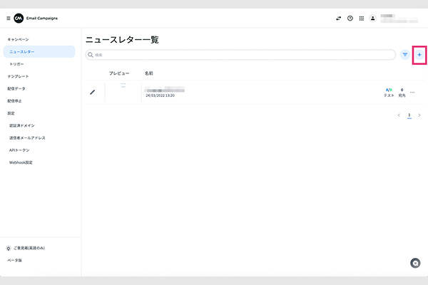 「ニュースレター」の右上の「+」ボタンから、新しいキャンペーンを作成します。