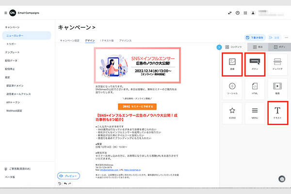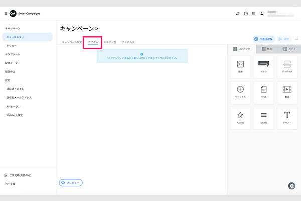 次に、メール内容の作成に移ります。「キャンペーン設定」の横の「デザイン」のタブを選択します。このタブをクリックするとドラッグ&ドロップエディターで誰でも簡単にHTMLメールを制作できます。