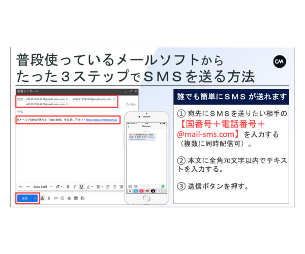 CM.comの提供する企業向けSMS送信サービス「MailSMS」を利用すると、YahooメールからEメールを送る手順で簡単にSMS(ショートメール/ショートメッセージ)を配信できます。新しく操作を覚えることも不要です。