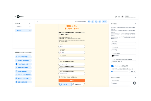 LPの作成画面左上の「+」から、セクションを追加し、生成された「Section2」を選択します。