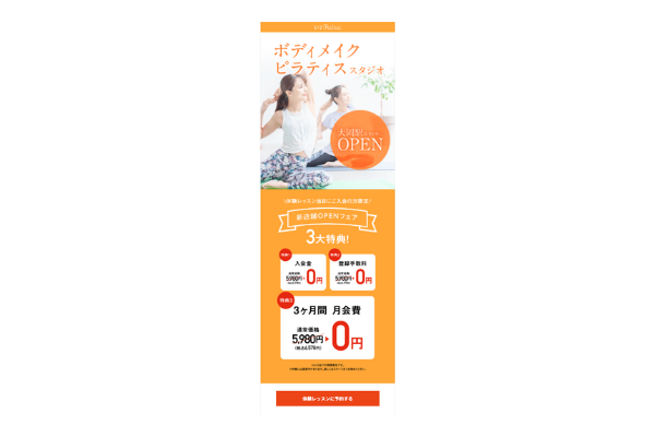 今回は、ピラティススタジオの新店舗オープンを記念して、スタジオ見学だけで終わってしまった方や退会してしまった顧客に対し、体験レッスンを案内するLPを簡単LP広告作成ツールで作成しました。