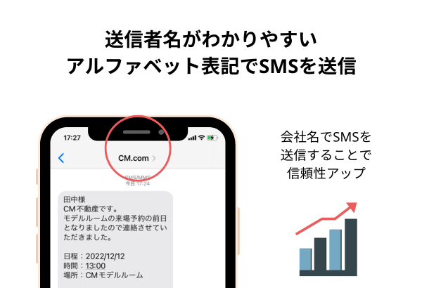SMSは送信者名を電話番号かアルファベットに設定できます。電話番号にするメリットとしてはお客様がメッセージを受信した時に電話番号から送信者を判断できます。デメリットとしては、一部のキャリアでは電話番号ではなく固定の4桁の数字に変換されてしまいます。