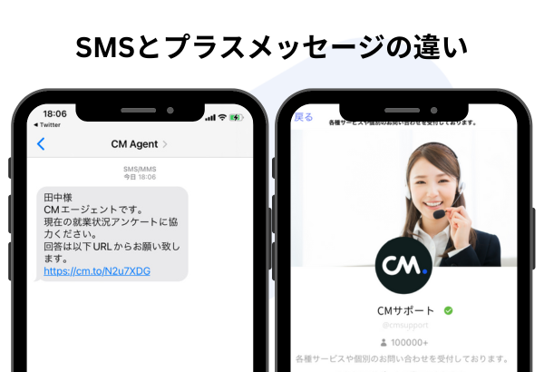 SMSではありませんが、同様に携帯電話番号宛に送信できる+メッセージの公式アカウントを発行することで、より信頼性の高いメッセージを送信することができます。