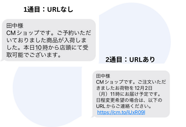 いずれもURLが原因を作っているので、URLなしのSMSで安心を与えます。本文には企業の電話番号や名前をきちんと挿入することを忘れないでください。