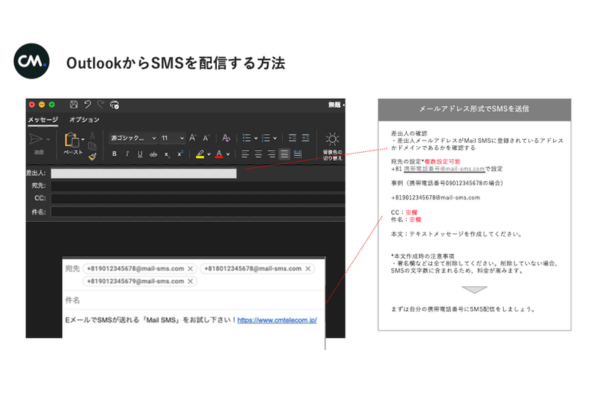 CM.comが提供するMailSMSサービスの利用登録を行い、普段利用している差出人メールアドレスを登録することで、すぐにOutlookのメール画面からSMSを送ることができます。