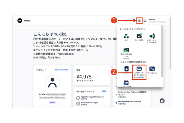 1.をクリックし、2.MailSMS(メールソフトやCRMからSMS配信a)を選択します。