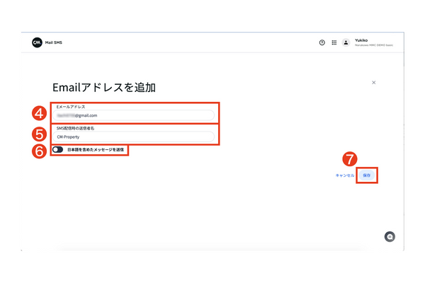 5.SMS配信時の送信者名(※3〜11桁のアルファベット英数字)を入力します。たとえば、「CM.com」や「CM Property」などと送信者名を設定します。