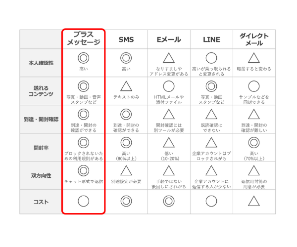 プラスメッセージは他のコミュニケーションチャネルよりもあらゆる面で優位性を持っています。BtoCビジネスで重要視される高い開封率に加え、消費者と簡単に双方向コミュニケーションを取ることができます。