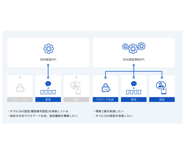 CM.comのAPIには、SMS配信のみを行えるSMS配信APIと、PWの発行から認証までを行えるSMS認証専用APIがあります。企業のニーズに合わせて使い分けることが可能です。