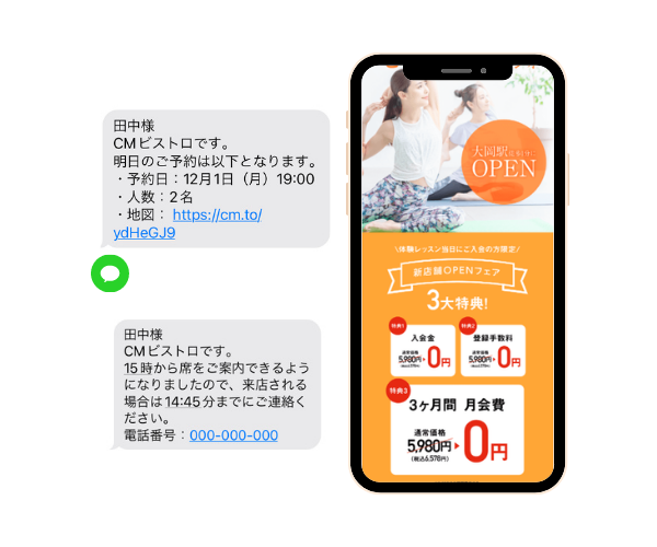 CM.comが提供する「Mobile Marketing Cloud」を利用することで、予約者への事前リマインドや空席状況の案内、アルバイトへの面接日程フォームの送信などをSMSとEメールで行うことができます。