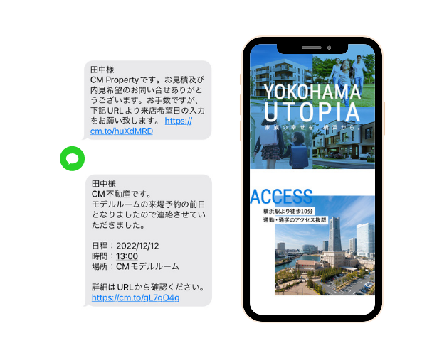 CM.comが提供する「Mobile Marketing Cloud」を利用することで、賃貸契約者とのコミュニケーションや新規物件情報、不動産投資案件、セミナー情報などの案内を効果的にSMSとEメールで行うことができます。