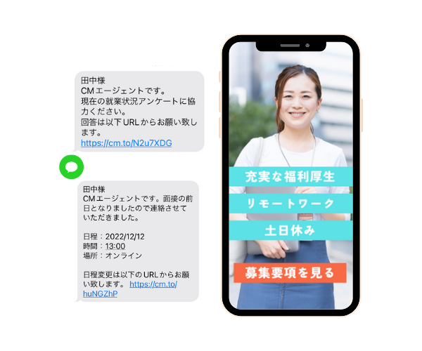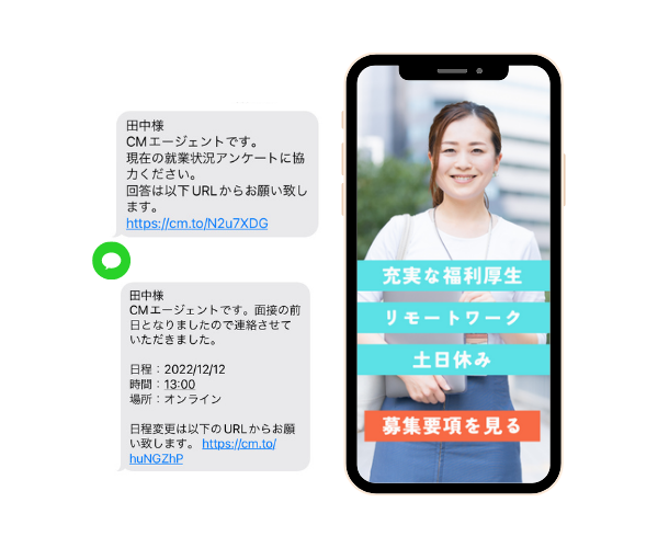 SMSでのスカウトメールの送信や新着求人情報の送信、面接日程の決定など、採用プロセスにおいて生じる顧客とのコミュニケーション問題をSMS送信で解決することができます。