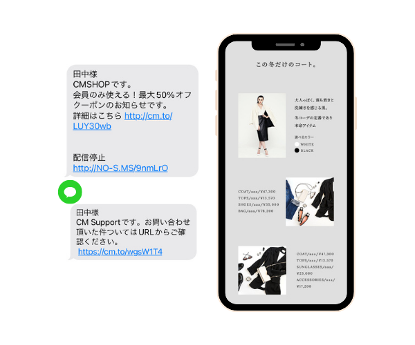 「メールでは読まれない」「電話は繋がらない」とならないように、SMSで新商品や入荷情報を届け、購買を促すコミュニケーションを実現できます。