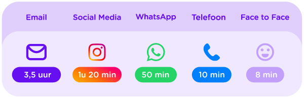 Bijna de helft (48%) van de Nederlandse consumenten geeft de voorkeur aan contact opnemen met de klantenservice via e-mail. E-mail wordt meestal gebruikt als er geen haast bij is. Maar let op: klanten hebben wel hoge verwachtingen. Wist je dat consumenten een reactie binnen 3,5 uur verwachten? Terwijl de meeste bedrijven streven naar een reactie binnen 1 werkdag of zelfs 24 uur. Dat is nogal een verschil!