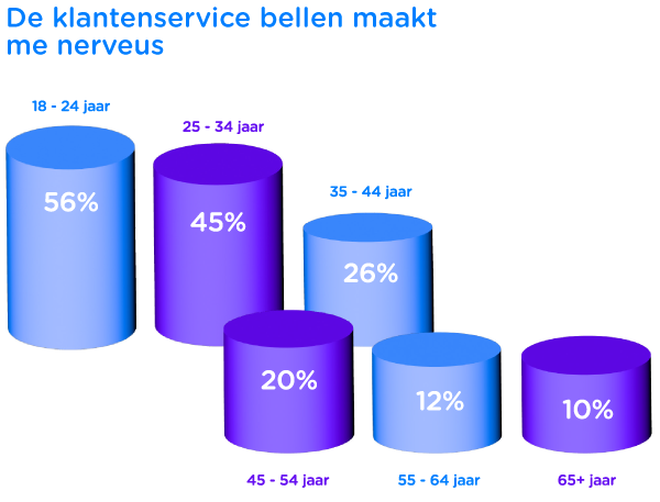 Maar liefst 89% wil bedrijven zo makkelijk mogen telefonisch kunnen bereiken. Ze verwachten gewoon het telefoonnummer op de website te vinden. Toch is niet alles positief over bellen: 3 op de vier Nederlanders belt alleen als het écht dringend is. Ook zenuwen spelen een rol: 25% is nerveus om de telefoon op te nemen. En hier is nog iets interessants: jongere mensen hebben meer belangst dan ouderen.