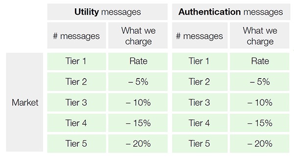 为鼓励企业增加消息发送量,WhatsApp Business平台将推出阶梯计价优惠。阶梯计价优惠仅适用于通知类和验证类模板消息,具体如下:
