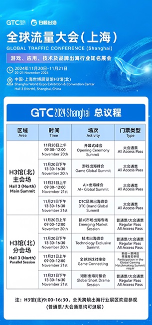 本次大会为期两天,包含游戏出海峰会、AI+出海峰会、DTC品牌出海峰会、新兴市场出海专场、技术出海峰会几个不同主题的峰会,以及全球游戏和短剧对接会。