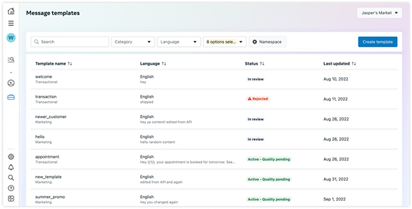 模板消息必须经过WhatsApp的预先批准才能使用。企业可以创建自己的模板提交审批,也可以使用WhatsApp提供的已有模板。一旦消息模板审批通过,企业就可以向选择在WhatsApp上订阅企业消息的用户发送此类模板消息。