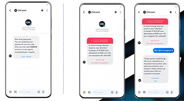 金融类企业可以使用认证过的Sender ID通过RCS向用户发送一次性密码,或者向用户发送安全提示、风险提示、交易通知等,更为安全可靠,让用户安心;除此之外,还可以向用户发送视频形式的促销信息,更好地向用户解释促销机制,也可以在用户完成一次交易后向其推荐其他相关产品;此外,用户还可以通过RCS的快捷回复功能进行一些简单的账户操作,比如转账给他人。