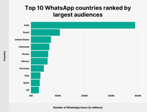 作为世界上最受欢迎的即时通讯软件,WhatsApp在全球拥有超过20亿的月活跃用户,覆盖180多个国家,每天通过WhatsApp发送的消息数量超过了1000亿条。通俗来说,全世界每100个人中,就有26个人在使用WhatsApp。作为中国企业出海的热门国家,印度、巴西、美国、印尼、俄罗斯、墨西哥、德国、意大利、西班牙、英国同时也是WhatsApp受众排名前10的国家。